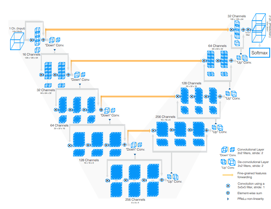 - UNet은 maxpooling을 통해 down sampling을 하였지만, VNet에서는 conv연산을 통해 진행했다.