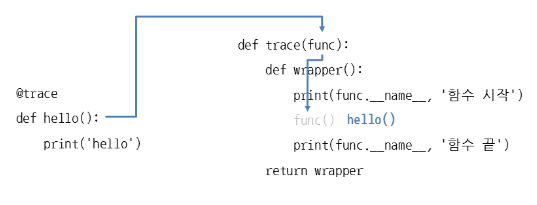 trace_hello = trace(hello) # 데코레이터에 호출할 함수를 넣음