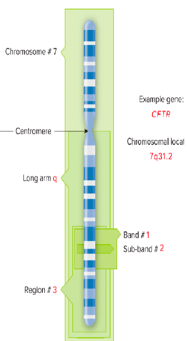 CFTR 유전자는 '7번 염색체의 q-arm의 3번째 영역의 첫번째 밴드의 2번째 서브밴드에 있다' 이런식이다.