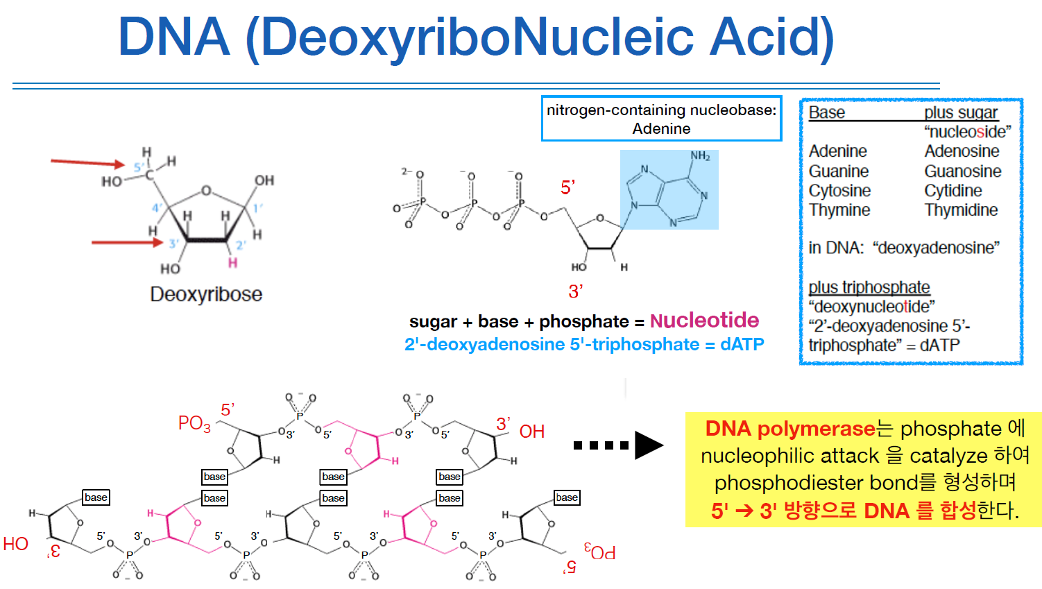 Nucleotide strand에 phosphate group이 붙어있고, 그 다음에 sugar가 붙는다.