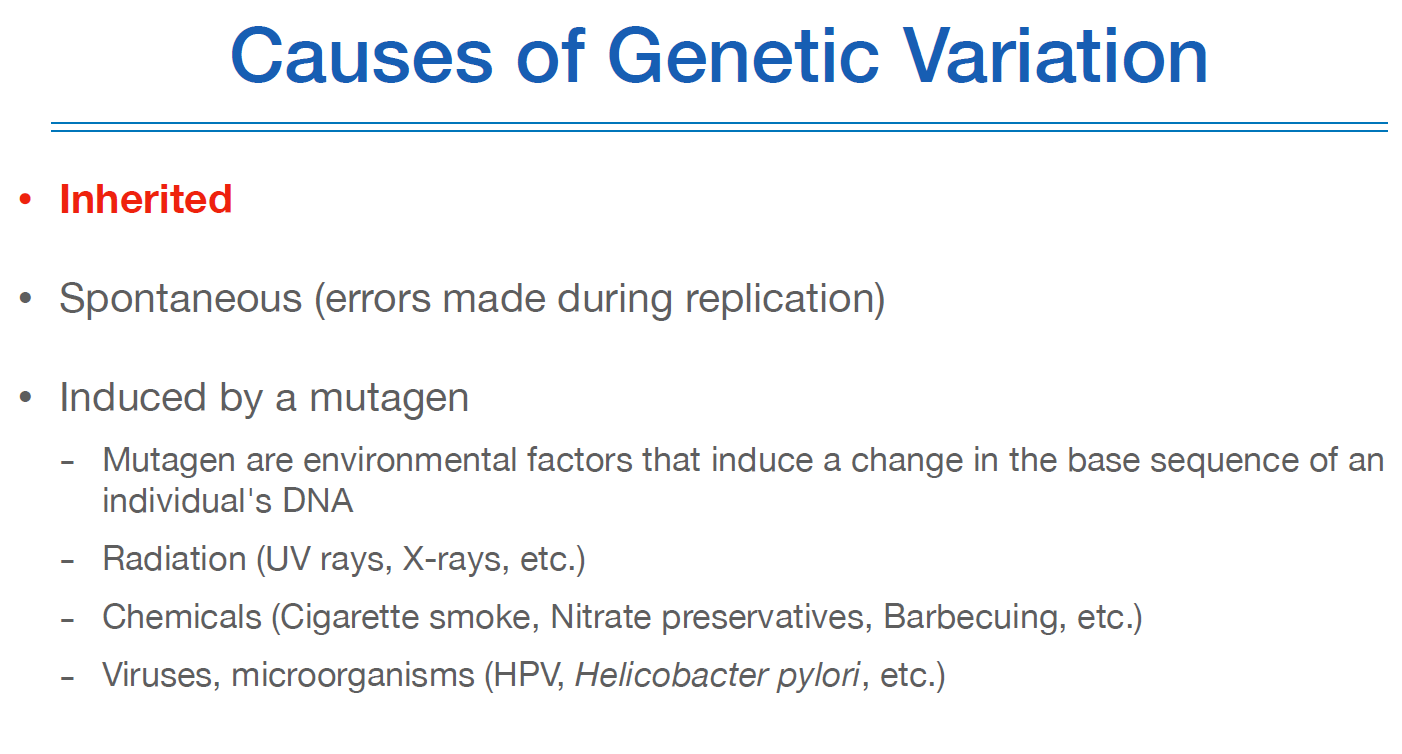 일반적으로 상속받은 것이 가장 크고, 상속은 잘 되었지만 복제단계에서 오류가 나거나, 바이러스나 방사선과 같은 돌연변이 유발요인(mutagen)에 의한 것이 있다.