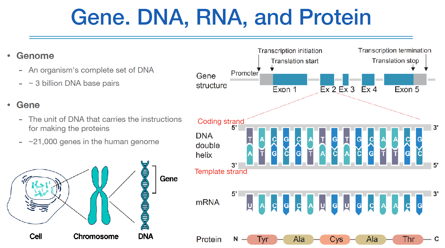Gene은 DNA에서 실제로 protein을 만드는데 역할을 하는 unit을 의미하며, genome에 21,000개 정도 있다고 한다.