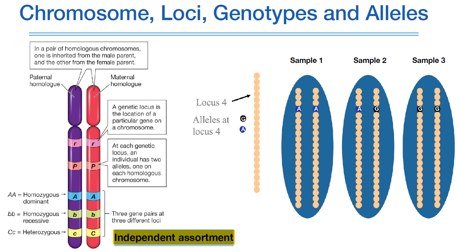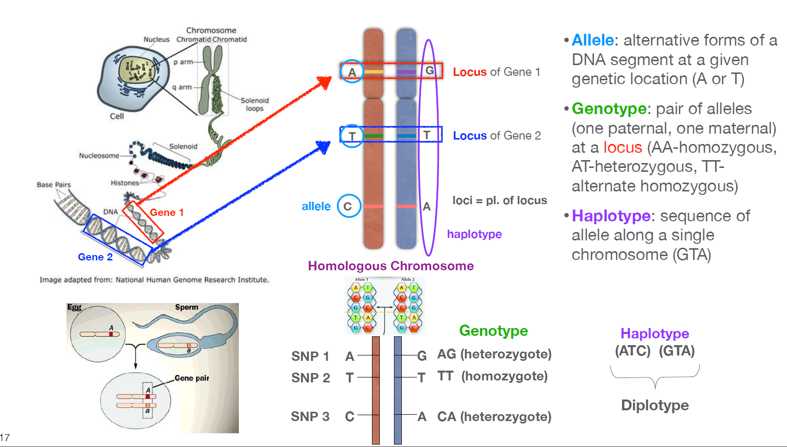 Allele[얼릴]은 주어진 유전적 위치(locus)(A 또는 T)에 있는 DNA 세그먼트의 대체 형태이다. 즉, Homologous chromosome에서 같은 유전적 위치에 있는 상대편의 DNA 이다. (위 그림에서 빨간색(paternal)과 파란색(maternal))