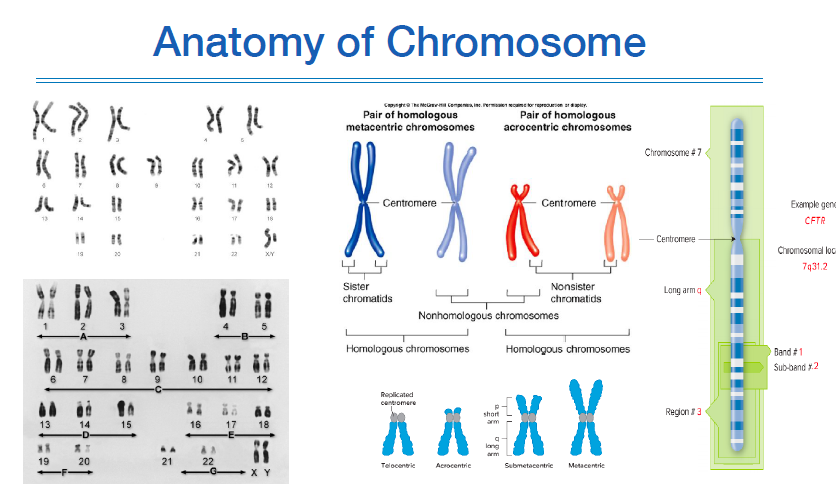 염색체 중앙은 centromere라고 하며, centromere 위쪽은 p-arm, 아래쪽은 q-arm이라고 한다.