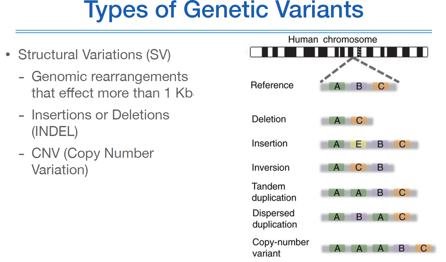 이런 변이는 사이즈에 따라 다르게 불리는데, SNV(single-nucleotide variant), INDEL(small insertion/deletion), SV(structural variant) 순이다.