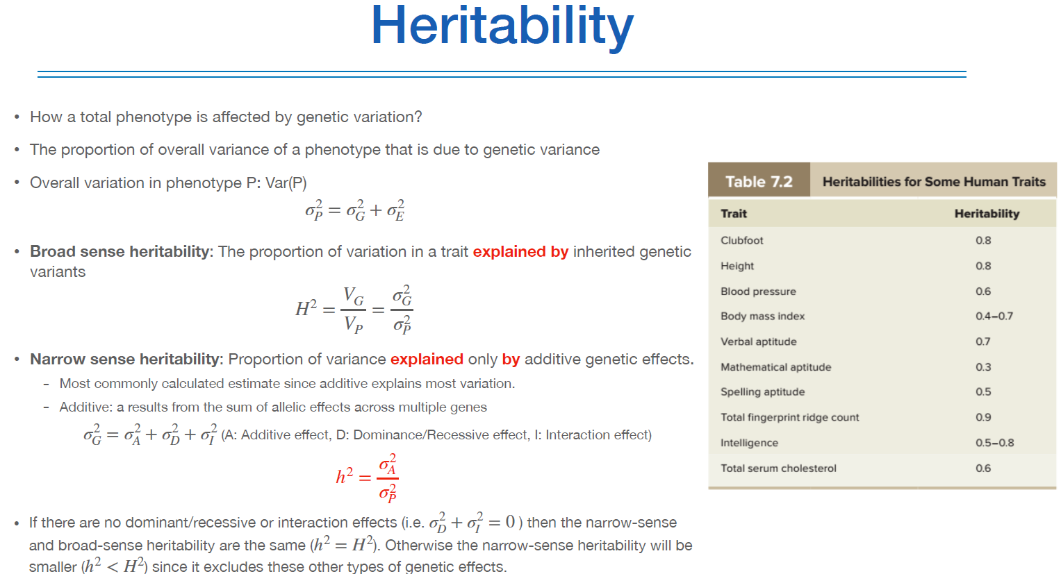Broad sense heritability는 H^2로 전체 phenotype 변동성에서 inherited genetic variants 변동성의 비율을 나타낸다.