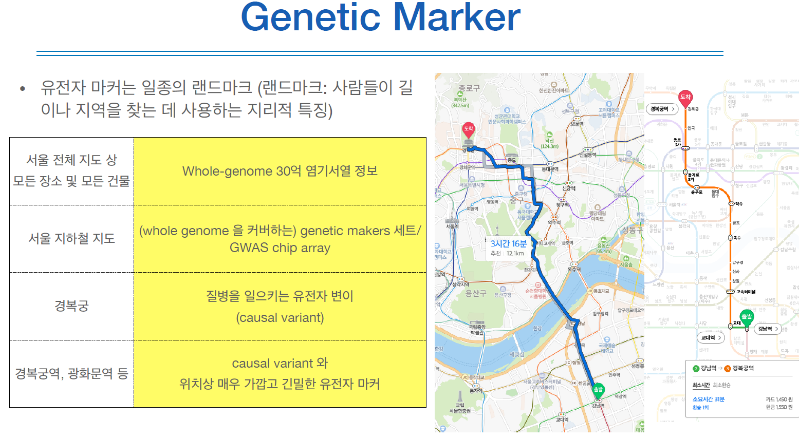 지하철 타고 가는 방법은 causal variant와 위치상 매우 가깝고 긴밀한 유전자 마커로서, 경복궁에서 내려서 조금만 둘러보면 경복궁을 찾을 수 있는 것과 같다.