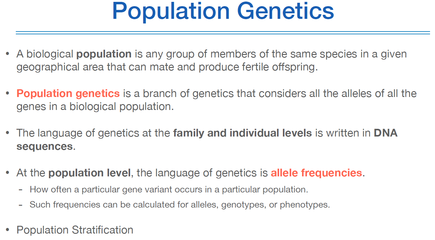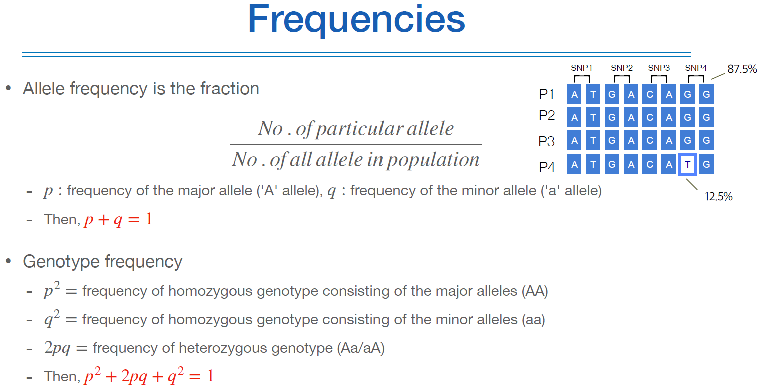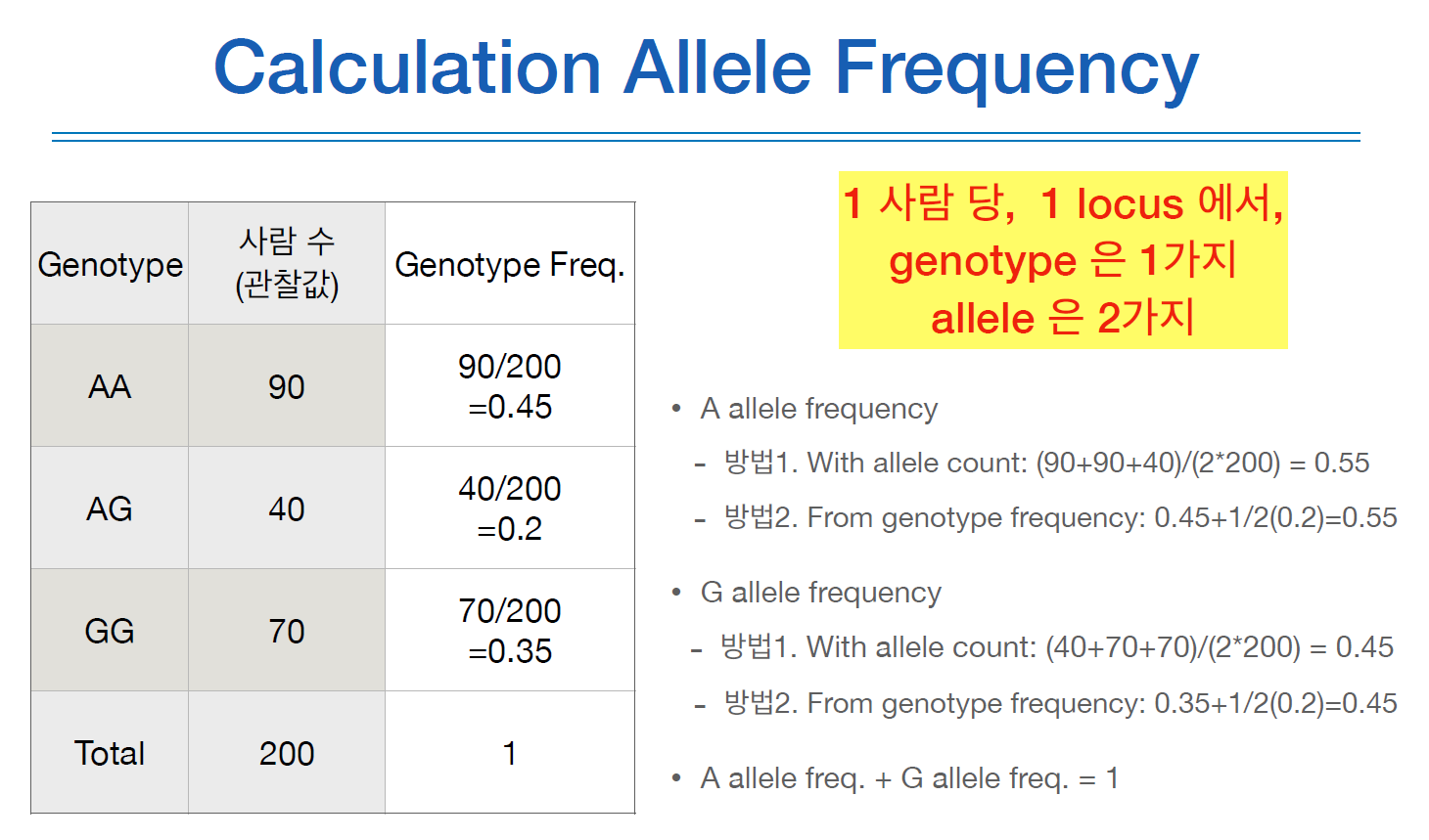 한편, population genetics의 genetic language는 하나하나의 염기서열이 아니라, 그 population에 얼마나 많이 관찰되는지 allele frequency에 대한 내용이다.