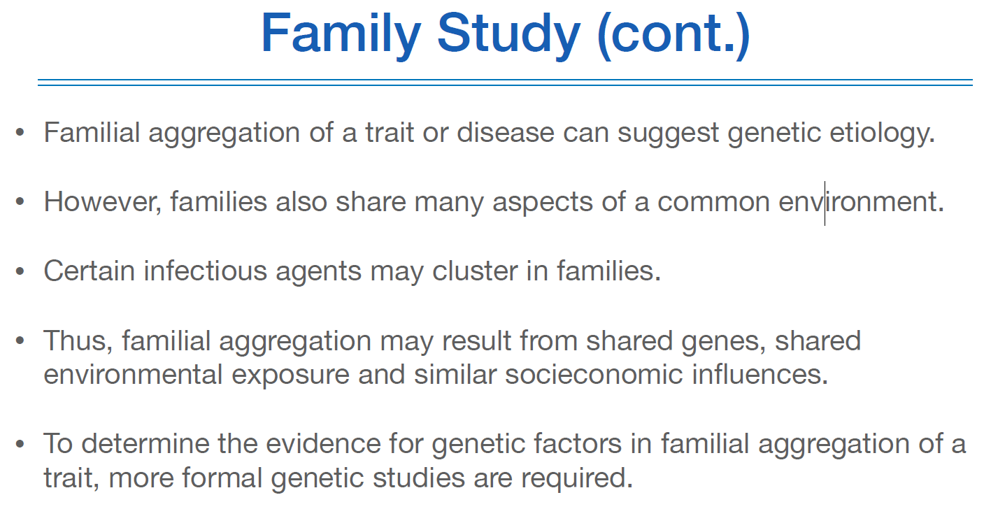 가족끼리는 환경적인 요인도 공유하기 때문에, genetic factor의 증거를 제시하는 것은 family study에서 중요하다.