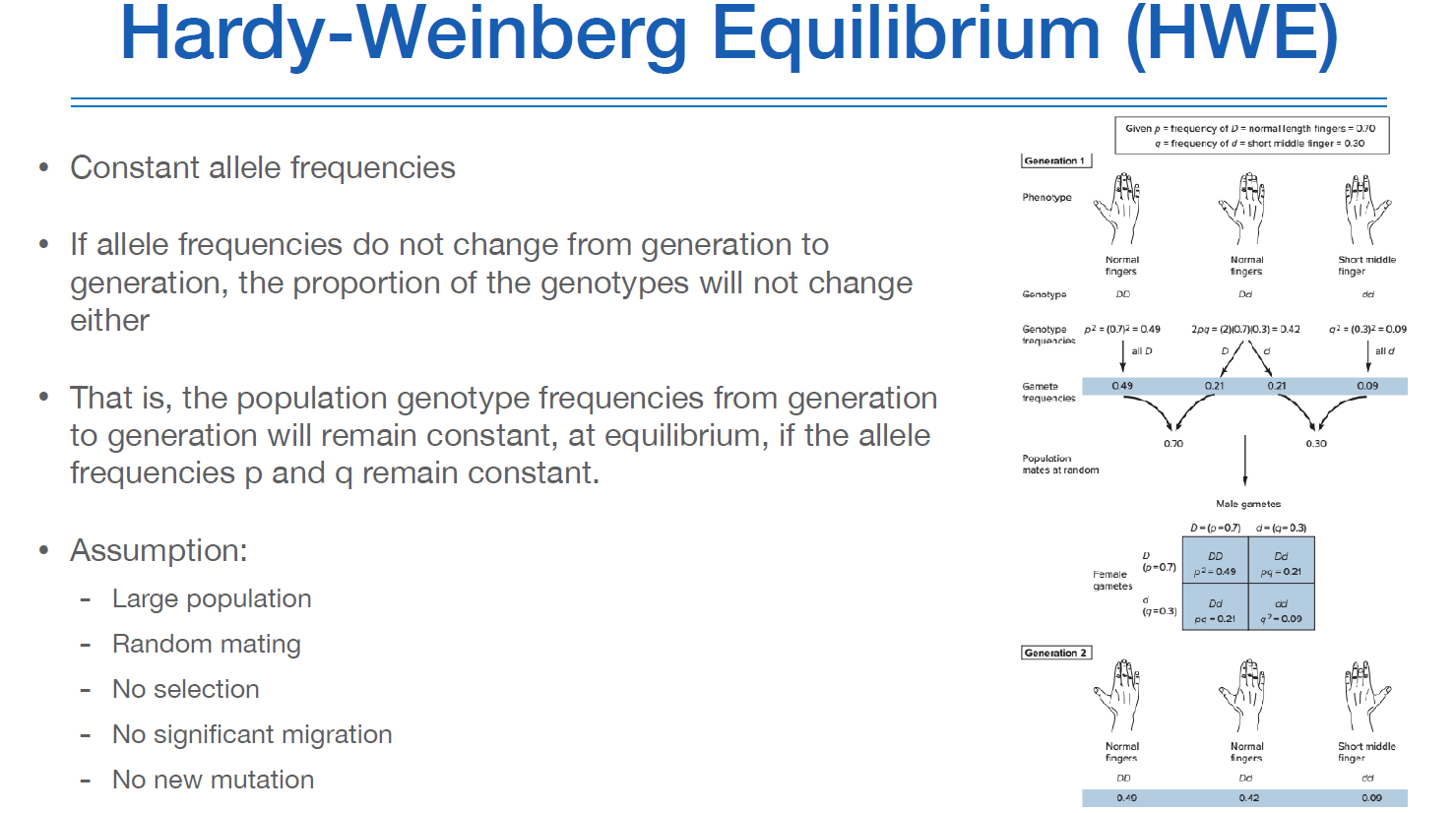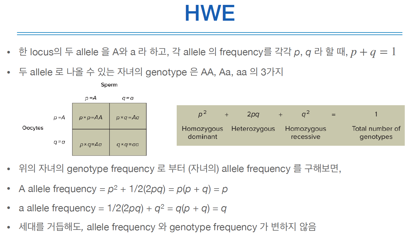 HWE는 allele frequency가 세대를 거듭해도 항상 일정하다는 이론이다.