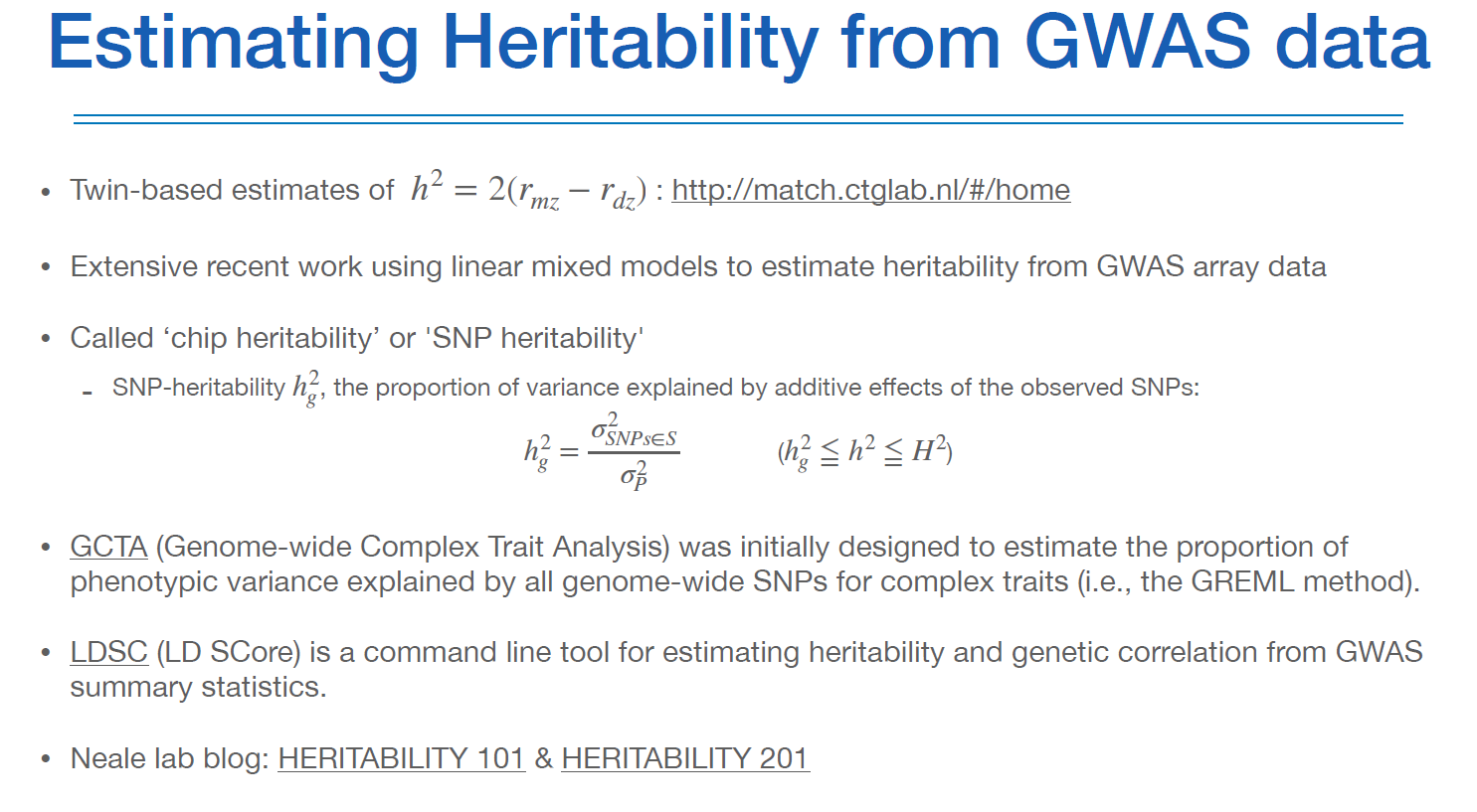 또한 최근에는 GWAS 어레이 데이터에서부터 heritability를 계산하기 위해 SNP-heritability라는 h^2(g)의 공식을 위와 같이 만들어냈다.