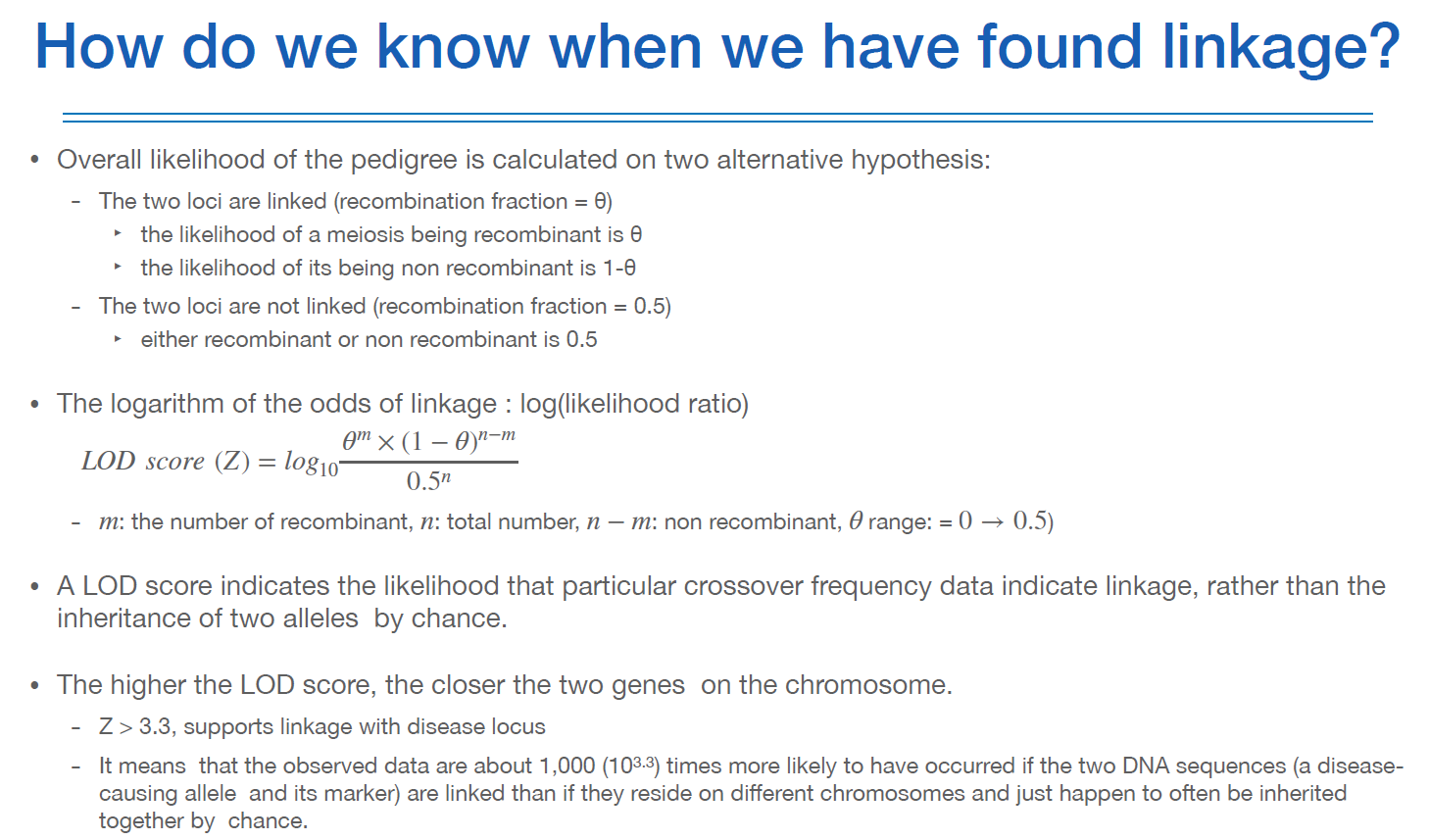recombination rate의 계산을 왜 하냐면, linkage 분석을 해서 어떤 마커 로커스를 찾았으면, 실제로 질병 로커스랑 긴밀히 연관됐는지 통계적으로 보기 위해서고, LOD score로 판단한다.
