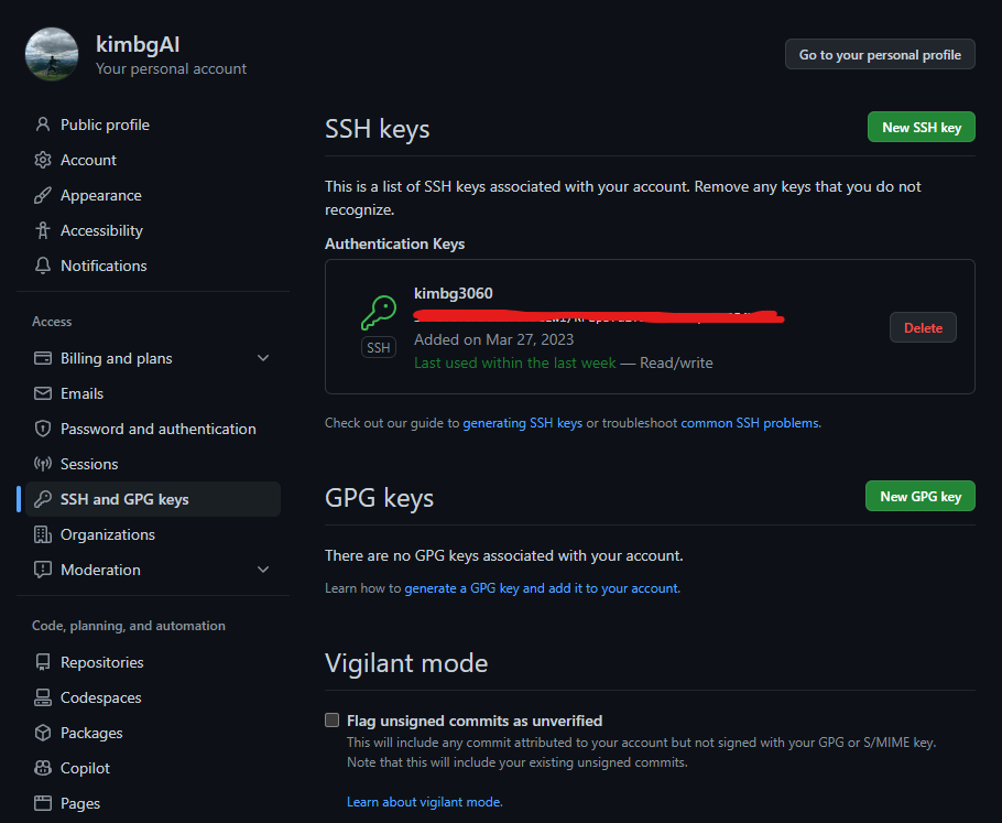 깃허브에 가서 setting에 들어가고, SSH and GPG keys에 들어가면, SSH keys를 등록하는 곳이 나온다.