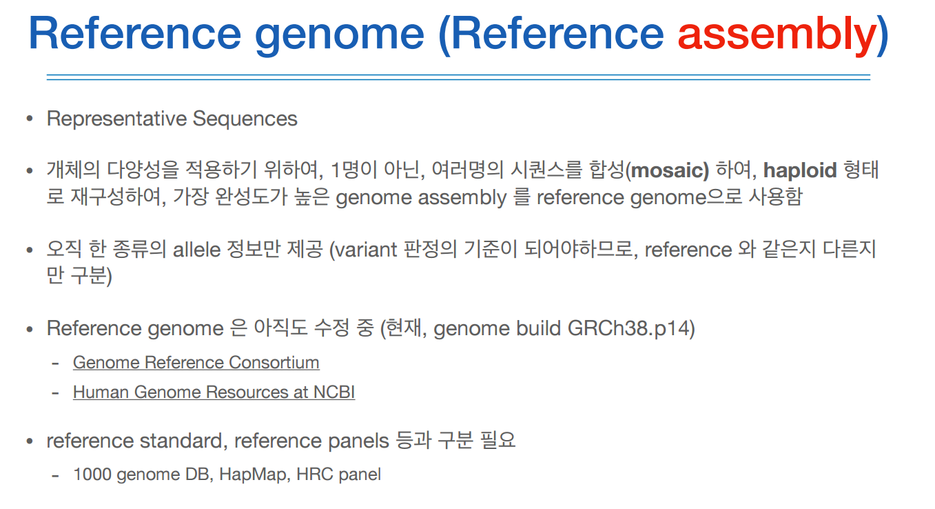 레퍼런스 지놈은 레퍼런스 어셈블리라고도 불리는데, 이 레퍼런스 지놈은 여러명의 지놈을 합성하여 diploid가 아닌 haploid 형태(DNA 한 줄, 부모 중의 한 allele 정보)로 만들었다.