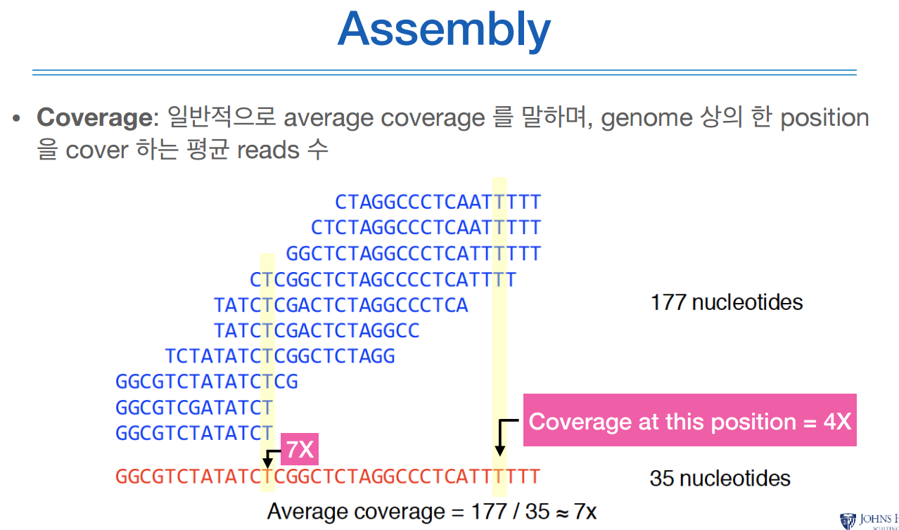 위 그림에서처럼 중간 노란색 염기서열 T는 리드간의 7개 겹치기 때문에 7뎁스, coverage 또는 7x라고 한다.