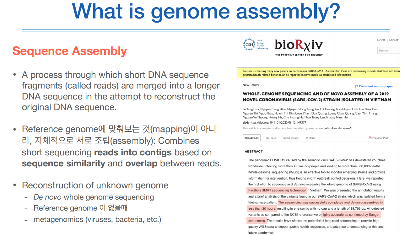 사람의 유전정보 뿐만 아니라 어셈블리는 최근에 코로나 바이러스를 이 드노보 시퀀싱을 통해 완성할 수 있었다.