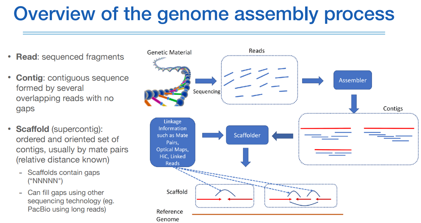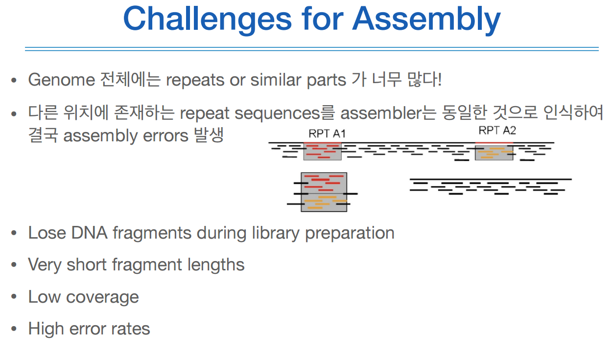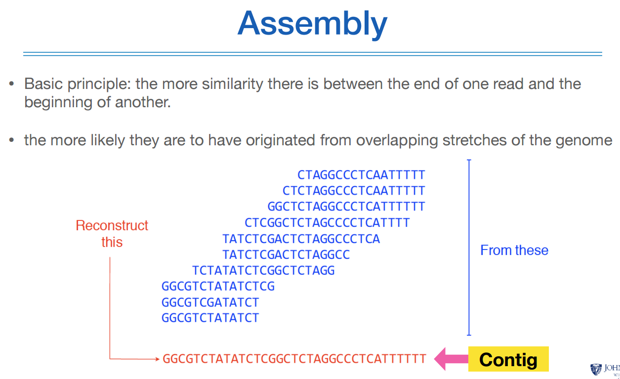 어셈블리 프로세스는 어셈블러라는 알고리즘을 통해 수천만개의 리드를 몇백개의 contig로 만든다.