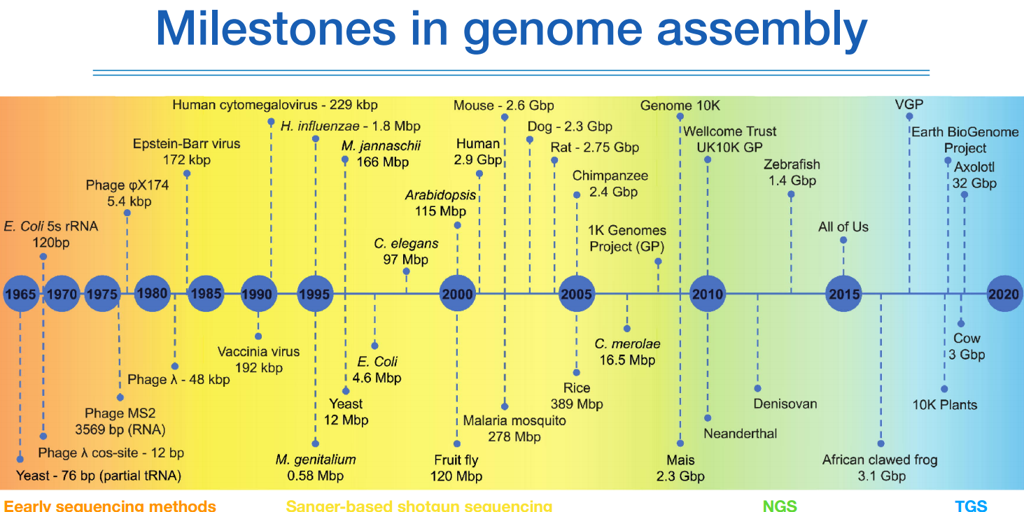 1965년부터 어셈블리 지놈의 역사가 시작되었고, 사람뿐만 아니라 강아지, 원숭이 등 과 같은 다양한 유기체에 대한 어셈블리 시퀀싱이 이루어지고 있다.