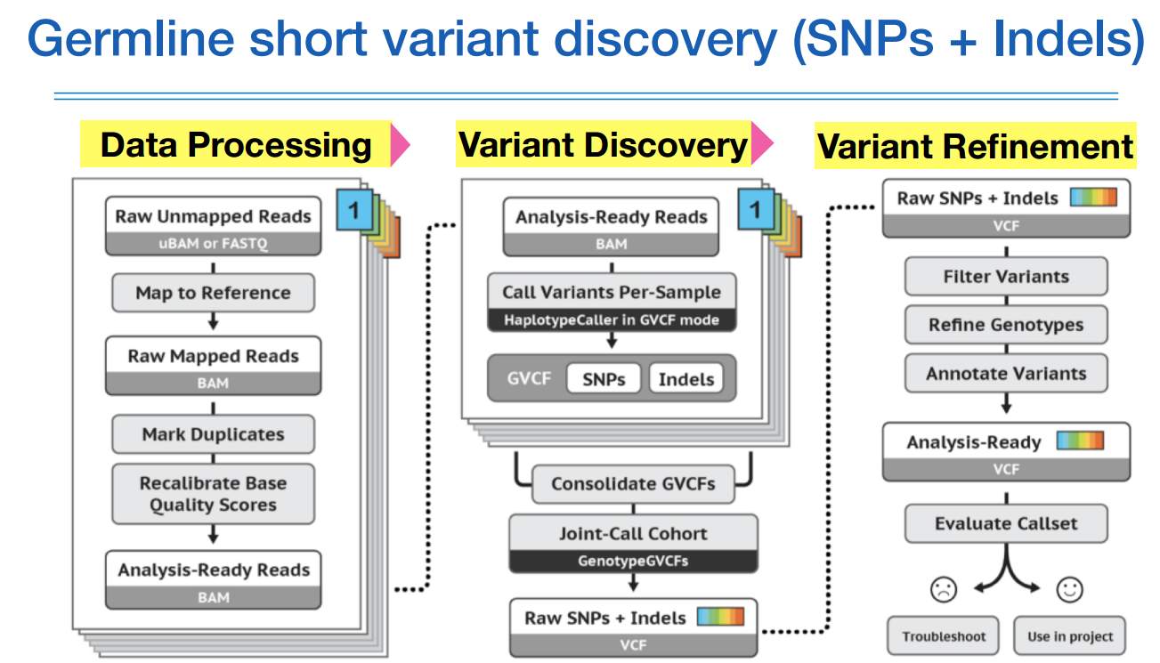 레퍼런스와 비교하면서 다른 것은 SNP, 레퍼런스에는 없는데 나한텐 있는 것은 insertion, 나한테 없는데 레퍼런스에 없는 것은 deletion 즉 INDEL 등 으로 처리할 수 있다.