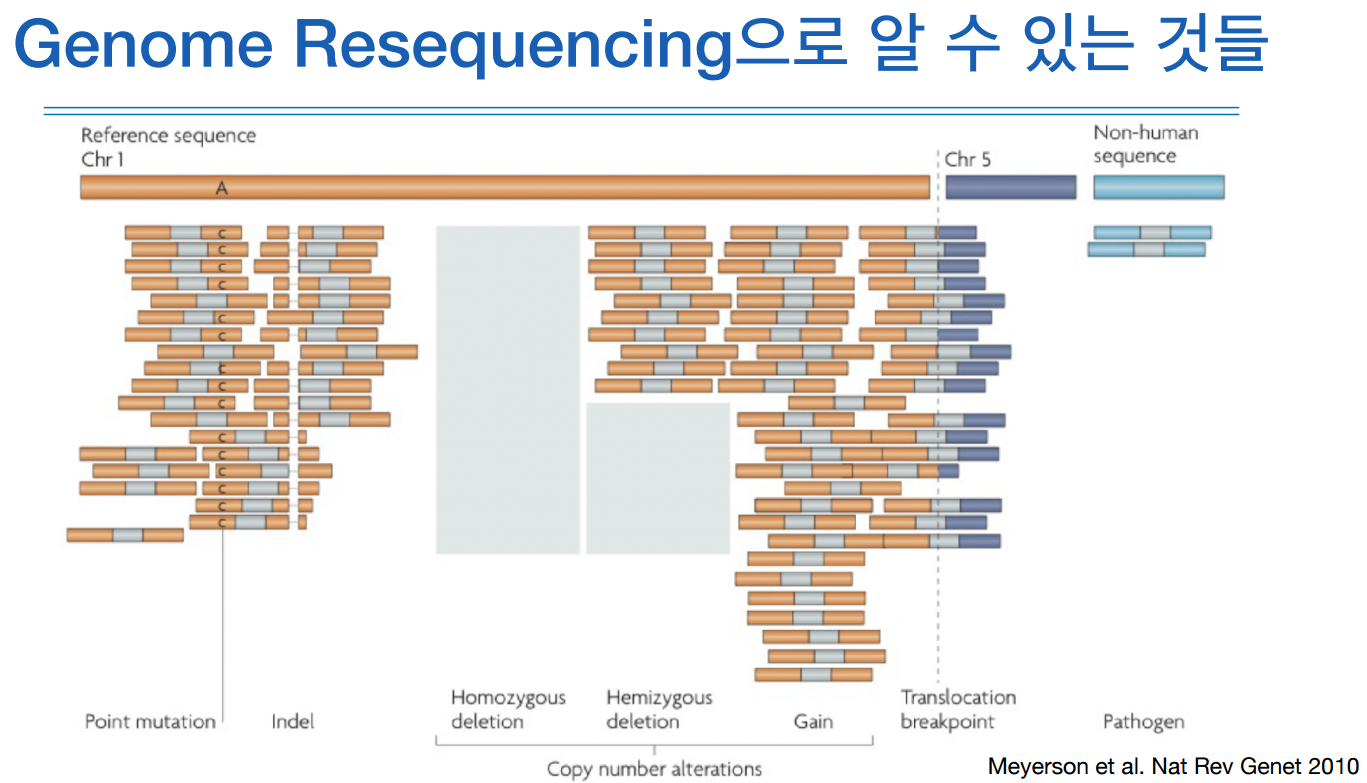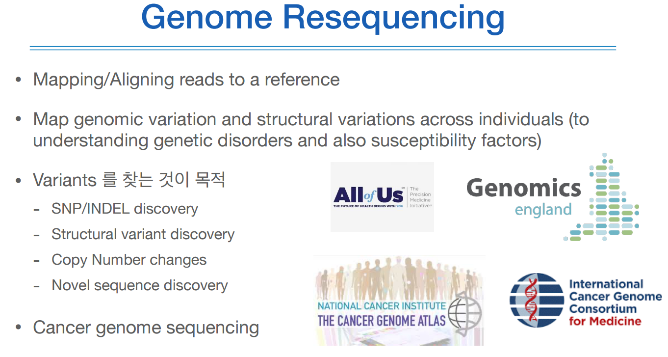 대부분의 시퀀싱은 이 리시퀀싱을 의미하고, 이것의 목적은 SNP/INDEL 등과 같은 variants를 찾는 것이다.