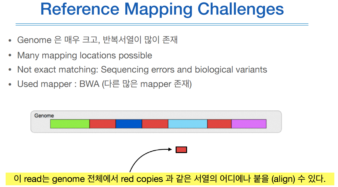 chip array 데이터는 이렇게 복잡하지 않았다. 왜냐하면 단지 이미 genetic marker를 가지고 있고 그 마커에 대해 맵핑만 하면 되기 때문이다.