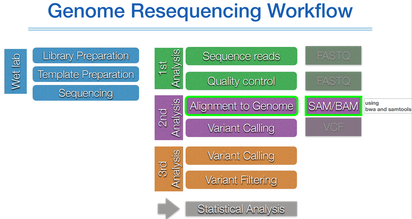 맵핑을 완료하게 되면 SAM 또는 BAM 파일을 얻을 수 있고, 이를 도와주는 SW는 BWA 또는 samtools가 있다.