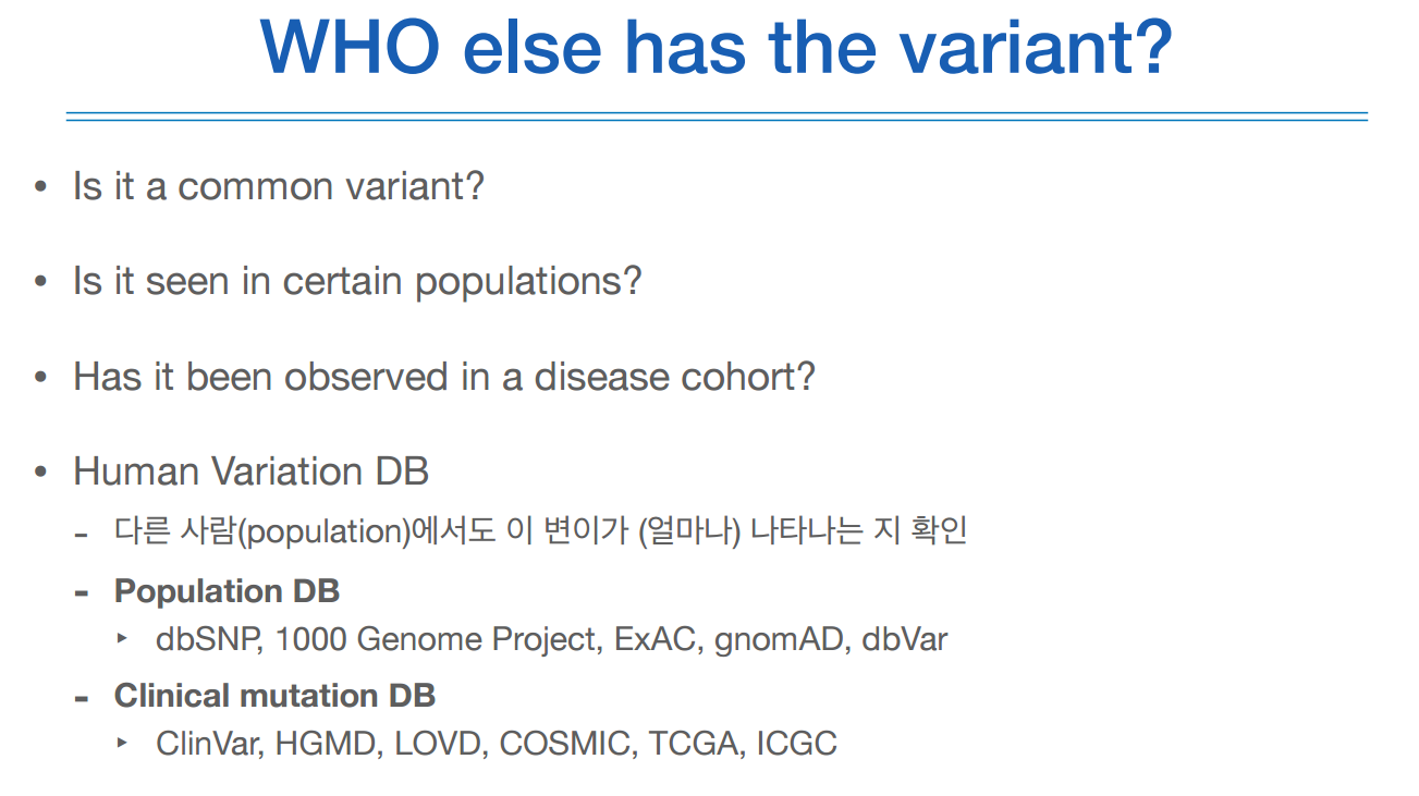 variant filtering은 위처럼, 퀄리티가 안좋으면 버리고, common하면 버리고, 이미 알려져있는 variant면 버리고 등등