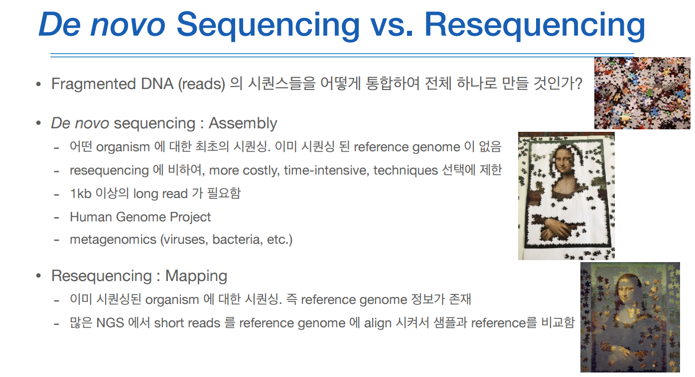 시퀀싱을 목적은 크게 두가지, De novo와 리시퀀싱으로 나누어 볼 수 있다.