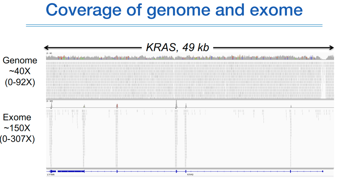 WGS는 모든 염기서열에 대해 빽빽하지만, WES은 아래 파란 엑손 부위에서만 빽빽하게 보이는 걸 볼 수있다.
