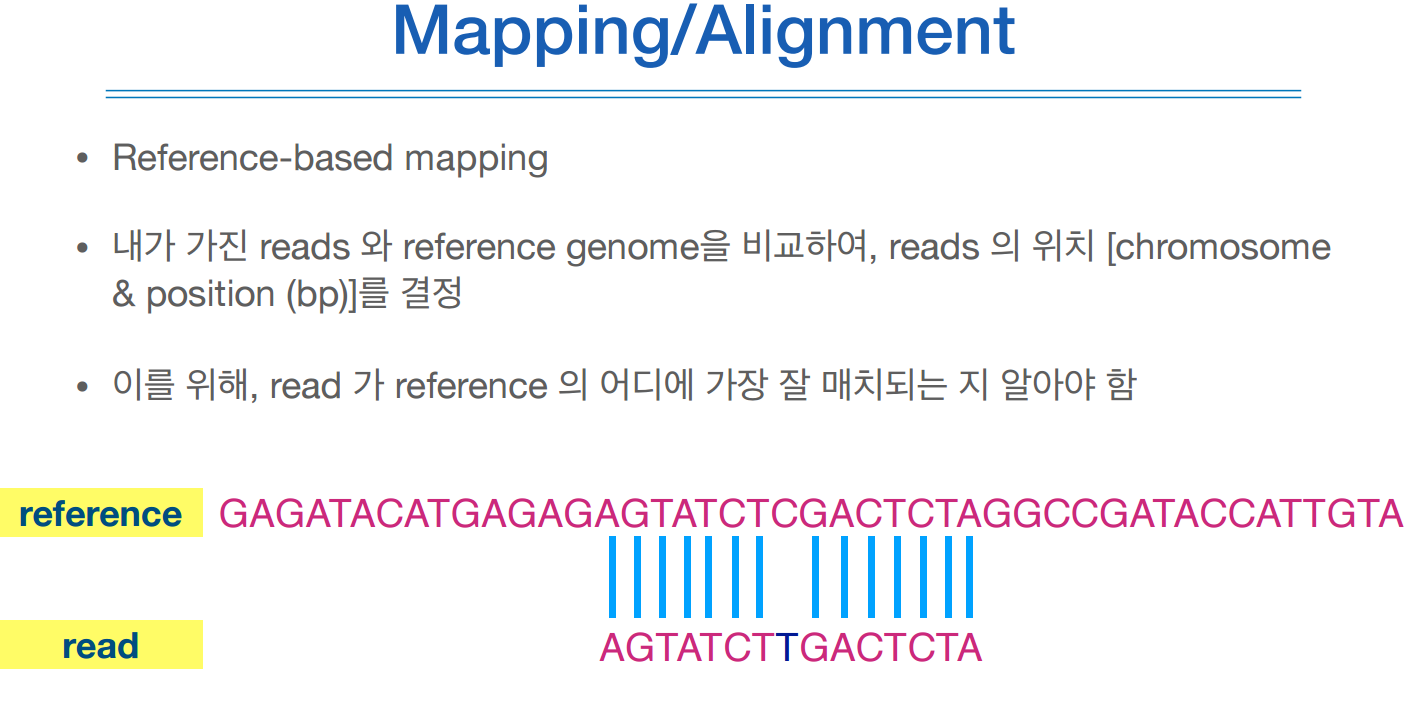 위 그림처럼 레퍼런스 시퀀스와 나의 리드를 비교하는데, 이게 레퍼런스와 100% 맞을 수 도 있지만 위 그림처럼 몇개는 안 맞을수도 있는데, 이를 어떻게 처리하는지는 맵핑해주는 툴들이 복잡한 알고리즘을 가지고 알아서 맞춰준다.