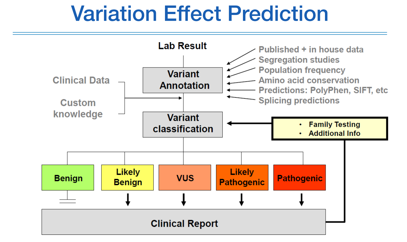 Benign부터 pathogenic까지 variant의 영향력을 따져서 리포트한다.