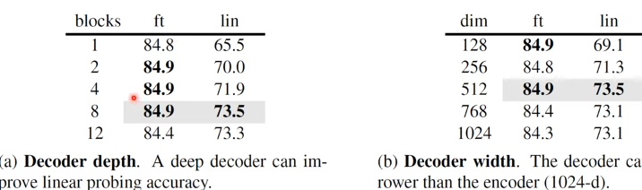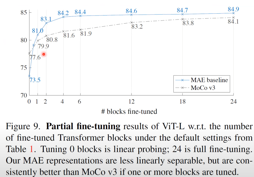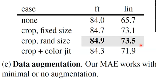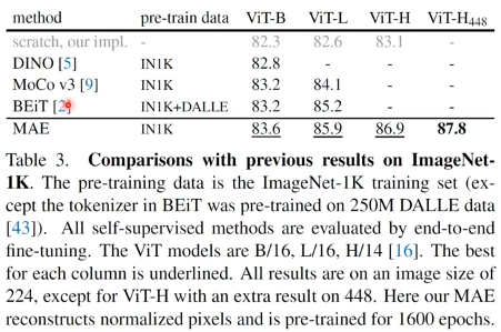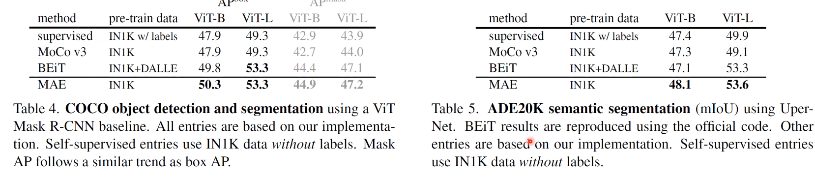 그래서 중간은 본 저자(FAIR)가 여러가지 실험을 했을때의 결과이고, 우측은 MAE을 사용했을때 결과.