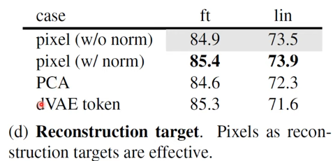 재구성을 우리가 original pixel을 예측하게 할것인지, 아니면 PCA coefficient를 예측하게 할건지, 앞서 설명한 BEiT의 사용된 token(dVAE)을 예측하게 할것인지 실험을 해봤음.