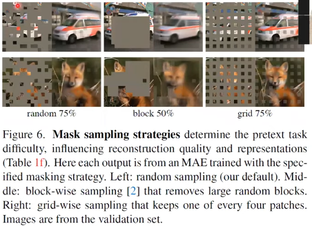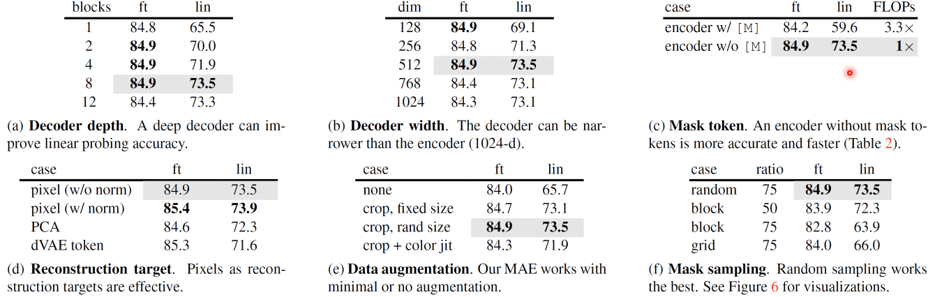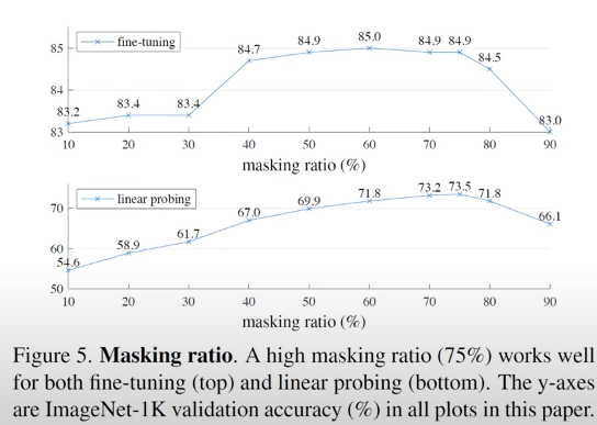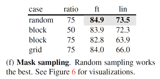 실험을 하나씩 보면, 마스크 비율에 따른 결과에서, 마스킹 비율이 높아질수록 성능이 올라가다가 75%에서 포화되는걸 볼 수 있음. 생각보다 높은 수준에서 마스킹이 필요한것은 놀라운 일.