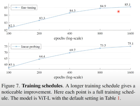 MoCo v3 같은 경우는 ViT-L 기준 300에폭에서 saturation이 되는데, MAE는 1600에폭까지 올라감.