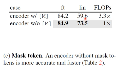 실제 inference할때는 마스킹이 안된 이미지들의 패치를 뜯어서 넣을텐데, 학습할때 마스크 토큰을 껴서 하게되면, 학습과 inference 사이의 괴리가 생기게 됨.