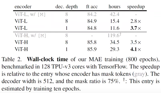 ViT-H 같은 경우에 4배 이상의 속도가 나타남. 25%만 남겨두고 학습하니까..